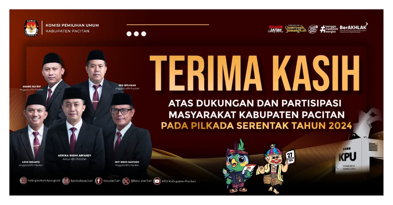 Ketua KPU Pacitan, Aswika Budhi Arfandy, bersama jajaran komisioner dan sekretariat KPU mengucapkan terima kasih atas tingginya partisipasi masyarakat serta dukungan dari berbagai elemen, termasuk penyelenggara pemilu, aparat keamanan, pemerintah daerah, tokoh masyarakat, dan media.