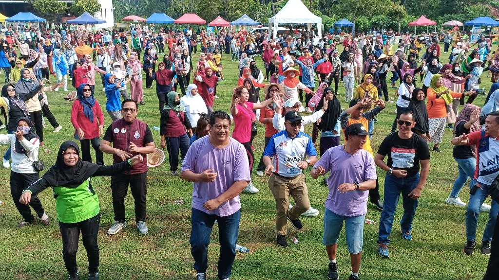 Dengan penuh semangat, warga dari berbagai desa mengikuti gerakan instruktur senam. Di barisan paling depan, Aji dan Gagarin turut berbaur bersama peserta lainnya.