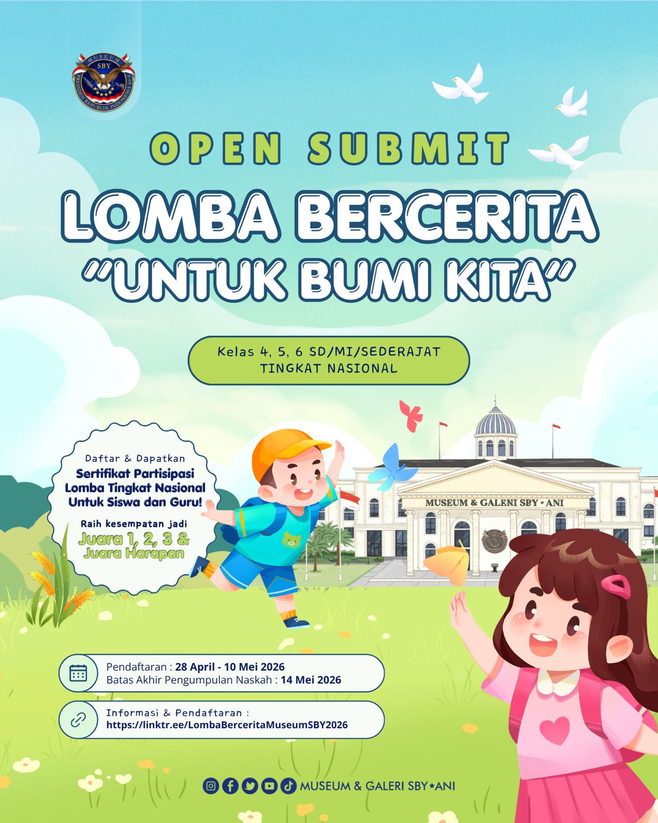 Kabar baik untuk siswa-siswi kreatif di seluruh Indonesia! Museum & Galeri SBY*ANI resmi membuka ajang Lomba Bercerita “Untuk Bumi Kita” tingkat nasional. Kompetisi ini menjadi ruang bagi anak-anak untuk mengekspresikan ide, kepedulian, dan imajinasi mereka terhadap bumi melalui karya cerita yang inspiratif.